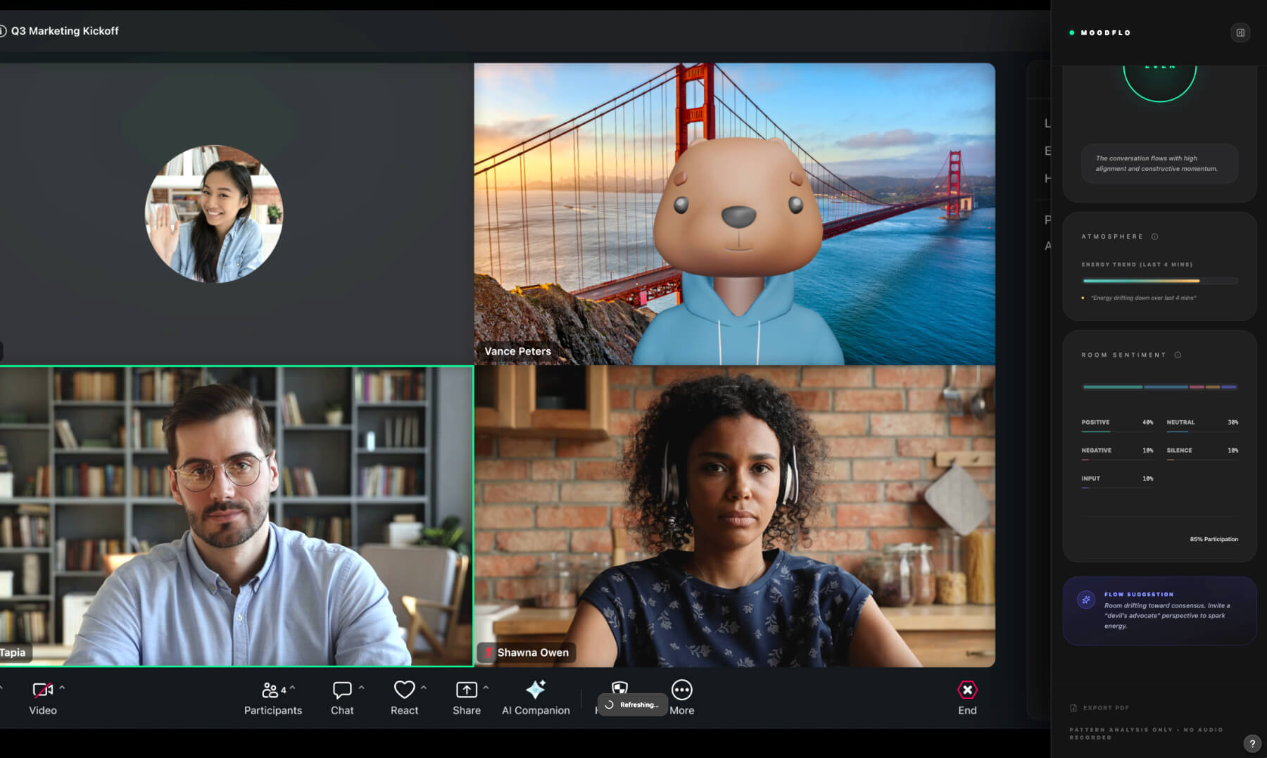 The slide-tray approach felt right from the very start. It keeps the meeting central while still allowing me to show the key panels: energy over time, sentiment balance, and room tone/participation and flow suggestions.